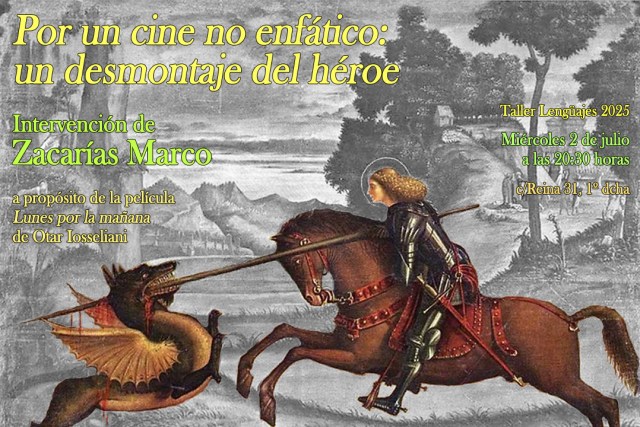 Tenemos, por una parte, el contraste entre el aburrimiento en la vida del padre y la conquista amorosa del hijo, y, por otra, un vínculo –misterioso– entre ambos elementos centrales, la pintura de San Jorge y el dragón. Un vínculo que, naturalmente, no puede ser casual. No lo es, por la actividad misma, la pintura, que conecta a padre e hijo, donde vemos la puesta en forma de la fantasía de cada cual; y no lo es, tampoco, en cuanto a la elección del motivo, del santo mismo, según nos desvela cómicamente uno de los diálogos iniciales. Y a todo ello se viene a sumar algo que va a ser determinante, la intervención en ese vínculo, en esa imagen icónica, que introducirá una modificación que, según se nos dice, no respeta del todo los cánones de la imagen. O sea, que la pintura del hijo mayor –al que ayudan novia y hermano– busca introducir un desmontaje de la imagen icónica del héroe, aunque se queda a medio camino, en espera de lo que haga el hermano menor. Adelanto que a estas intervenciones de los hijos seguirá otra del padre, otro desmontaje hecho también mediante la pintura, pero esta vez observando el devenir del cuadro que pinta el padre. Con ello cerraré la exposición de hoy.